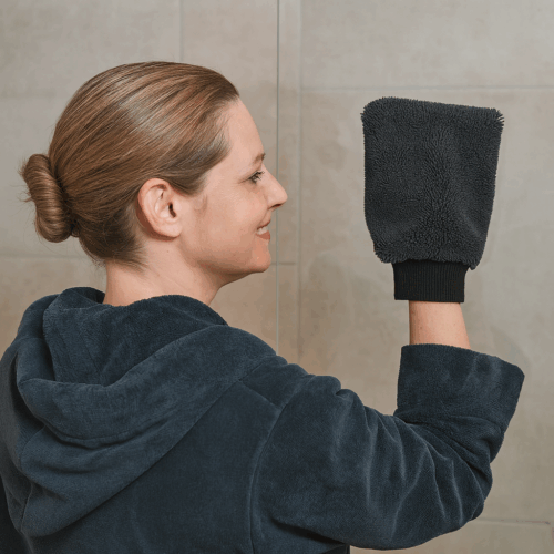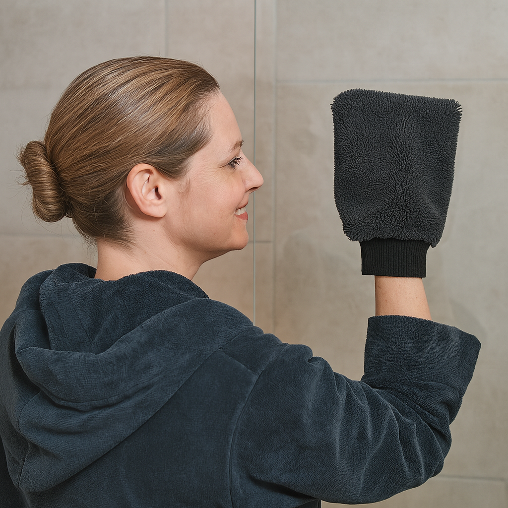 Je herkent het vast je bent klaar met douchen en moet nog even snel alles droogmaken. Je pakt een handdoek of douchewisser maar het resultaat is net niet goed genoeg. Alles lijkt droog maar voelt nog vochtig. Dat is precies waar kalk en schimmel ontstaan. Met onze microvezel handschoenen is dit verleden tijd. Trek de handschoen aan en wrijf over het oppervlak en je bent in seconden klaar. Glazen douchewand? Droog. Kraan? Glanzend. Spiegel? Streeploos. En dat zonder gedoe of druppels.