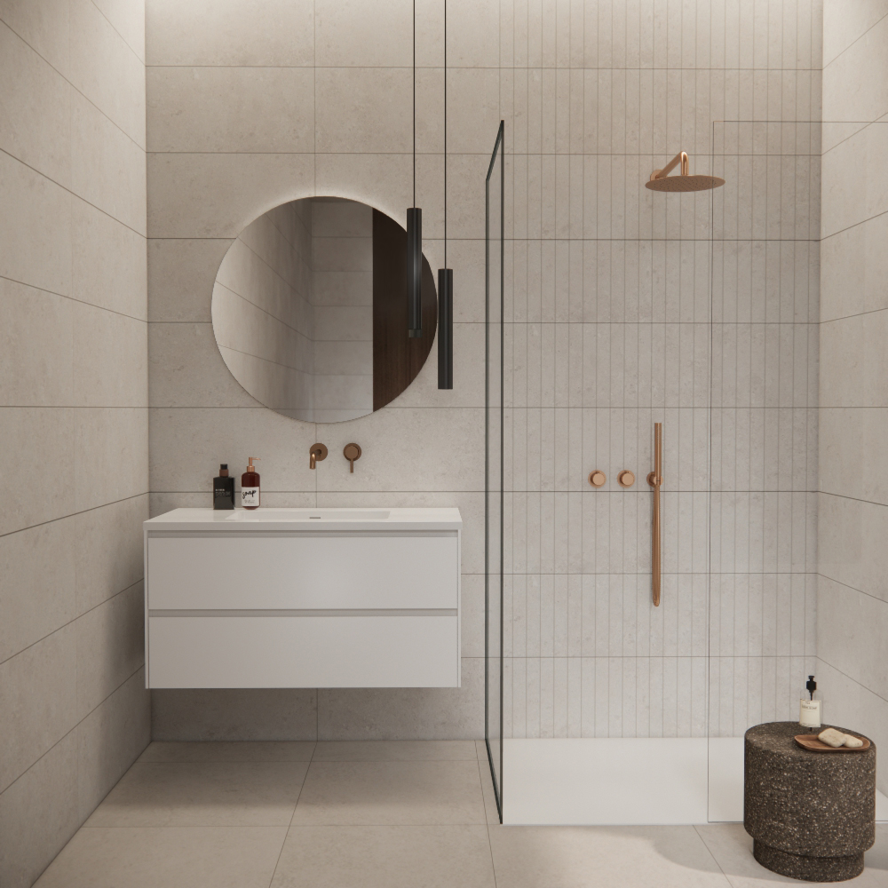De wastafel is van mineraalmarmer en afgewerkt met ronde hoeken waardoor het vuil zich nauwelijks kan hechten en het gemakkelijk schoon te houden is.