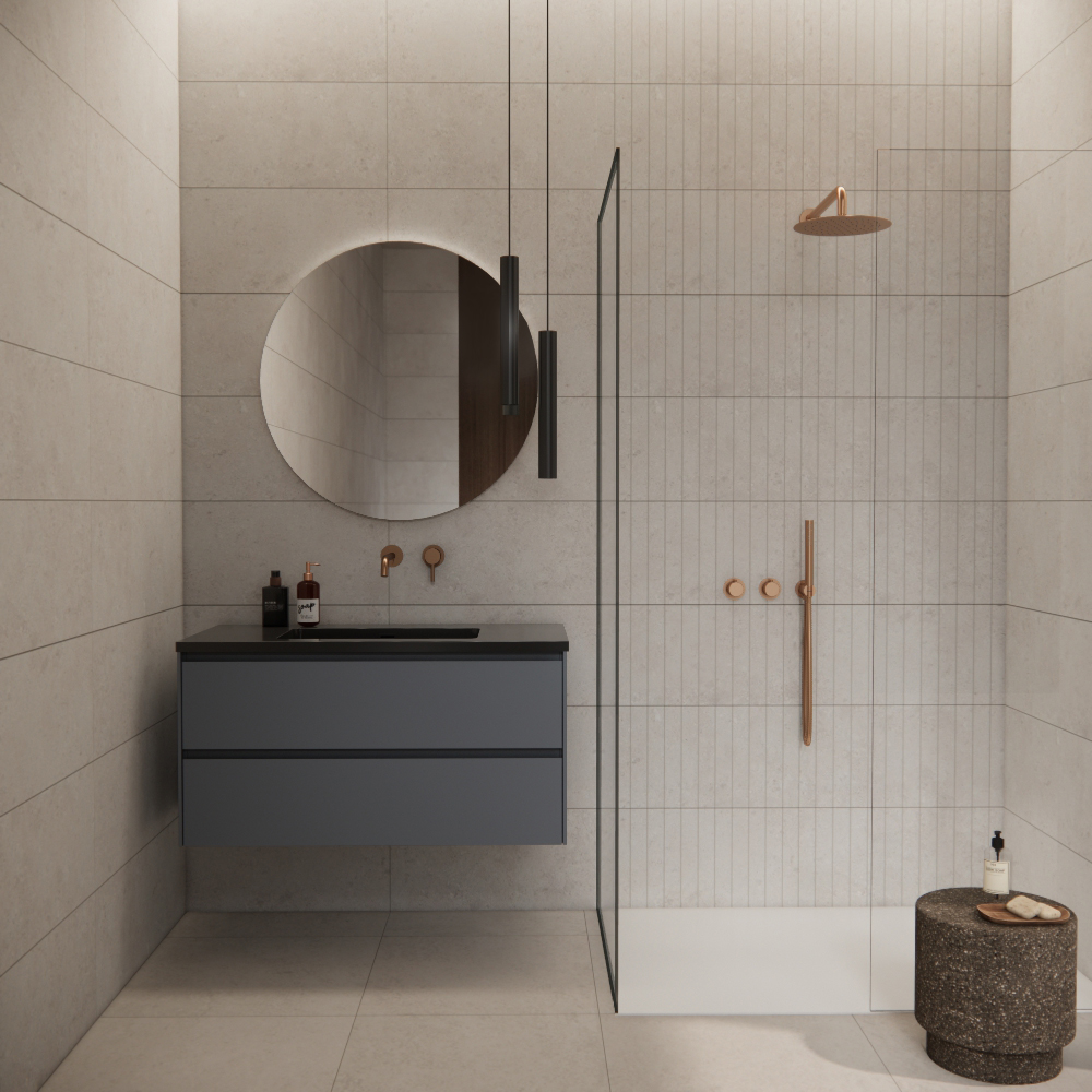 Badmeubel Nero 100cm mat grijs inclusief zwarte mineraal marmeren wastafel zonder kraangat. De wastafel is maar 2,5cm dik waardoor het meubel een strakke en moderne uitstraling heeft. Dit design past in iedere badkamer en is perfect te combineren met alle andere producten uit de serie Nero, zoals de kolomkasten.