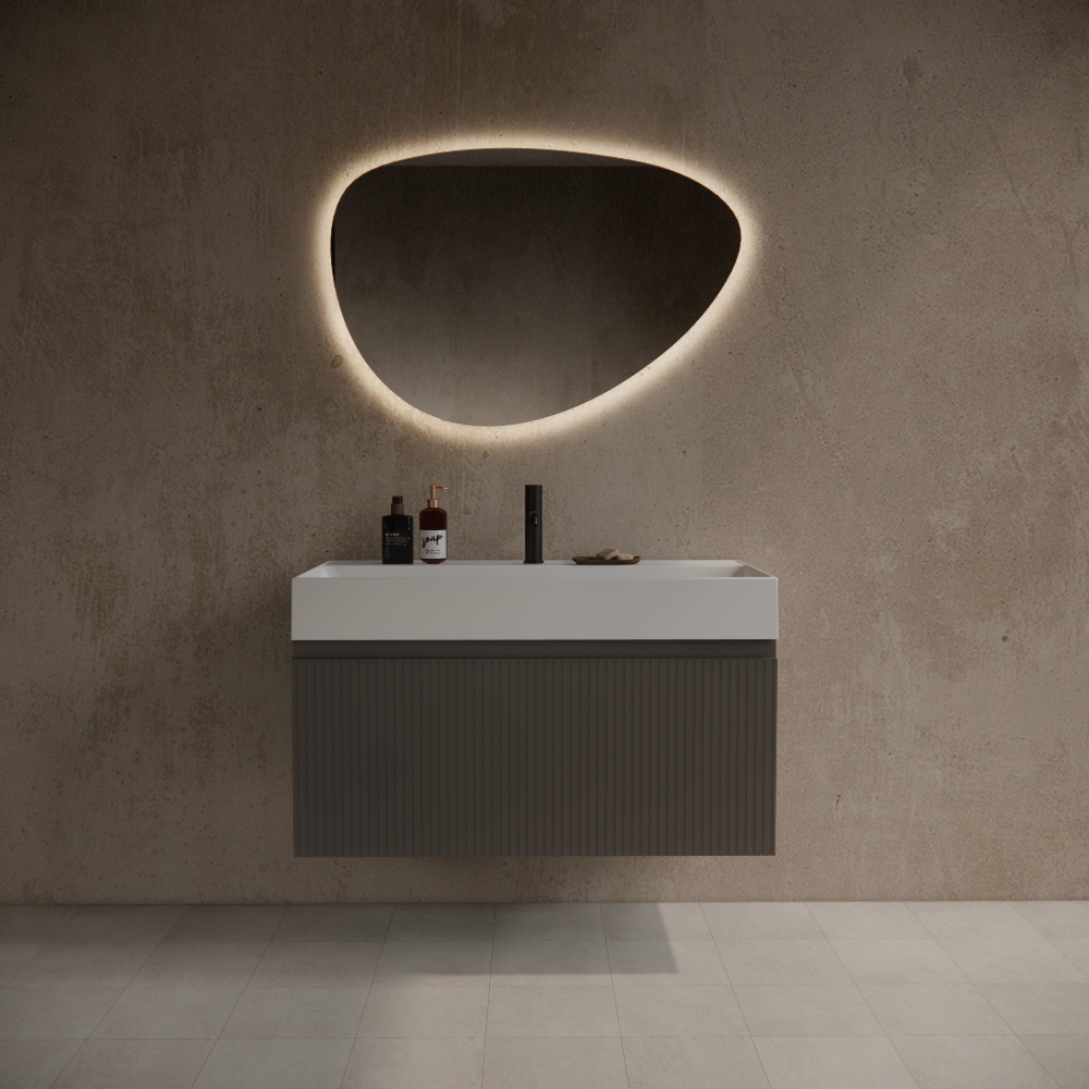 Badkamermeubel Yuki 100cm mat grijs inclusief wastafel robuust glans wit met kraangat