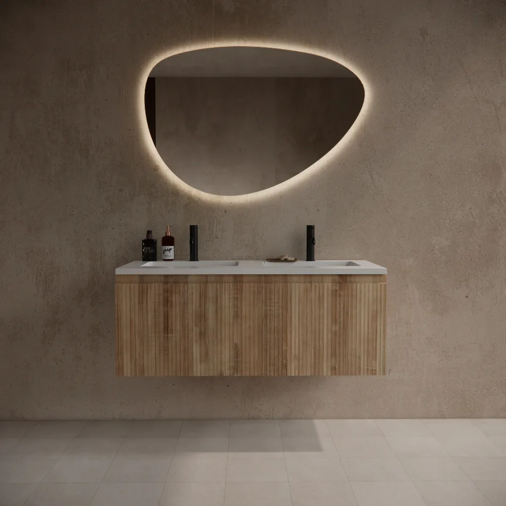 Badkamermeubel Yuki 120cm licht eiken inclusief dubbele wastafel met kraangaten mat wit