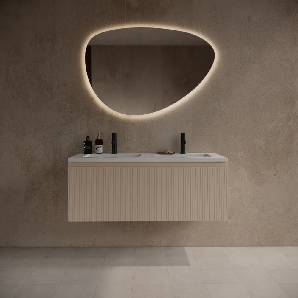 Badkamermeubel Yuki 120cm mat beige inclusief dubbele wastafel met twee kraangaten mat wit