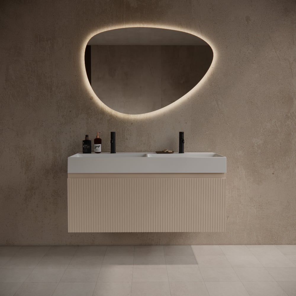 Badkamermeubel Yuki 120cm mat beige inclusief dubbele wastafel robuust glans wit met kraangaten