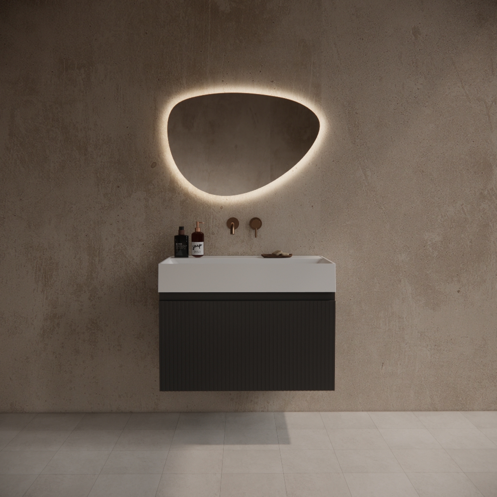 Badkamermeubel Yuki 80cm mat zwart inclusief wastafel robuust glans wit zonder kraangat