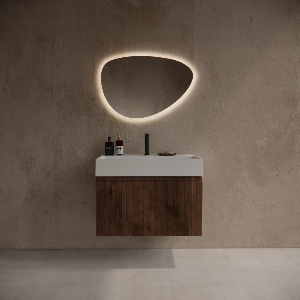 Badkamermeubel Yuki 80cm walnoot inclusief wastafel robuust glans wit met kraangat