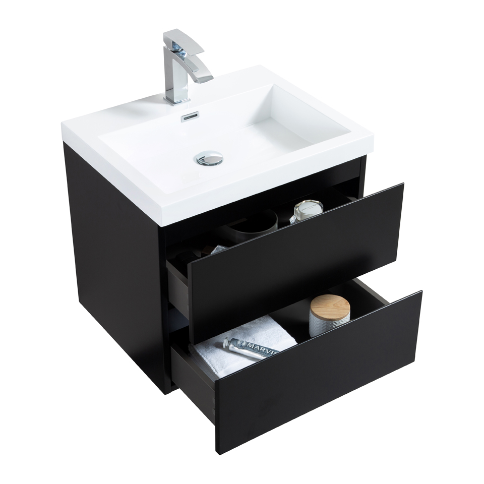 De onderkast is gemaakt van gelamineerd MDF en voorzien van twee lades met soft-close techniek. Deze techniek remt de lade automatisch tijdens het dichtschuiven, om deze vervolgens rustig te sluiten. De lades zijn voorzien van geïntegreerde grepen. Het kraangat is voorgeboord met een diameter van 3,5cm (universele maat).