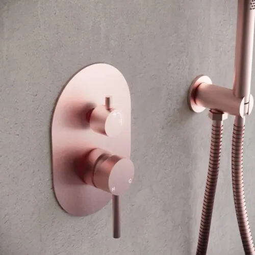 Inbouw regendouche met wandarm 30cm douchekop mat rosé goud ovaal complete set is het ideale alternatief voor de opbouw regendouches. Het inbouwdeel wordt in de wand gemonteerd wat voor een strakke en stijlvolle uitstraling zorgt. Doordat het inbouwdeel, wanduitloop en de opsteeksteekgarnituur op elke gewenste positie in de natte cel geplaatst kunnen worden bepaald u zelf hoe uw droomdouche eruit komt te zien. Een voordeel daarvan is dat het inbouwdeel bijvoorbeeld niet in de zelfde muur wordt gemonteerd als de wanduitloop van de hoofddouche waardoor u de douche aankunt zetten zonder meteen onder een koude straal water te staan. De set behoort tot de serie Rondo en is ideaal te combineren met alle artikelen binnen deze serie. Doordat alles met dezelfde kleur afwerking geproduceerd wordt voorkomt u kleur verschil en kunt u afzonderlijk in elke ruimte de moderne look doorzetten.