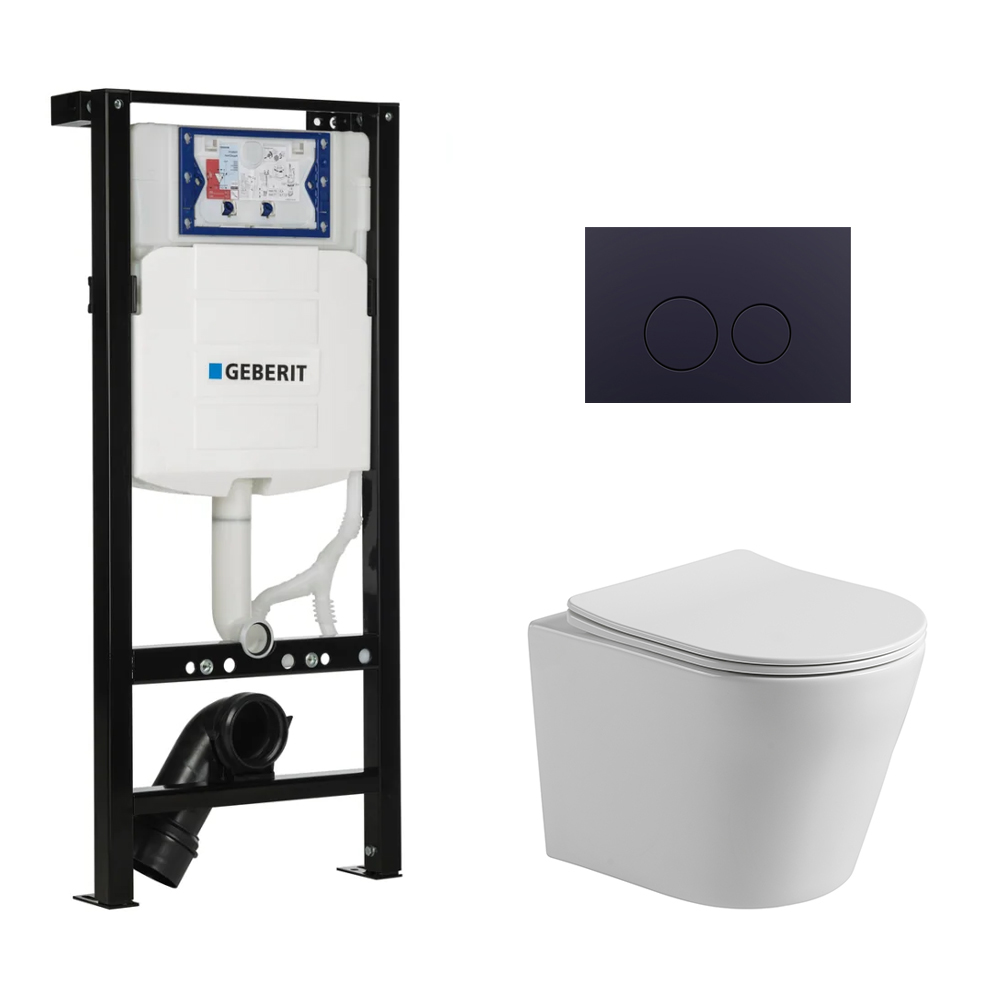 Toiletset Julio randloos glans wit met bedieningspaneel Flat mat zwart RVS en Plieger Duofix WC-element (UP320)