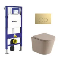 Toiletset Julio randloos mat beige met bedieningspaneel Flat mat goud en Geberit Duofix WC-element (UP320)