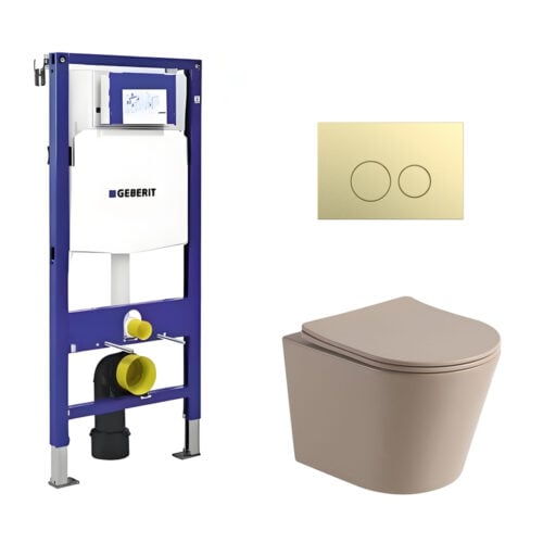 Toiletset Julio randloos mat beige met bedieningspaneel Flat mat goud RVS en Geberit Duofix WC-element (UP320)