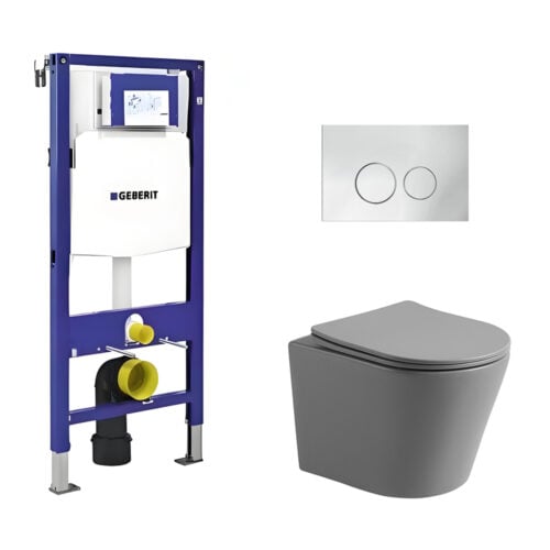 Toiletset Julio randloos mat grijs met bedieningspaneel flat chroom glanzend RVS en Geberit Duofix WC-element (UP320)