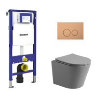 Toiletset Julio randloos mat grijs met bedieningspaneel Flat copper geborsteld RVS en Geberit Duofix WC-element (UP320)