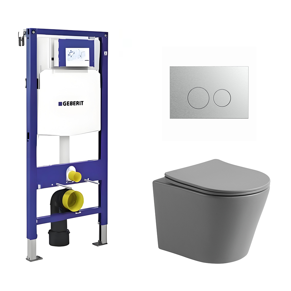Toiletset Julio randloos mat grijs met bedieningspaneel Flat geborsteld RVS en Geberit Duofix WC-element (UP320)