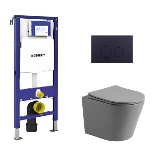 Toiletset Julio randloos mat grijs met bedieningspaneel Flat mat zwart RVS en Geberit Duofix WC-element (UP320)