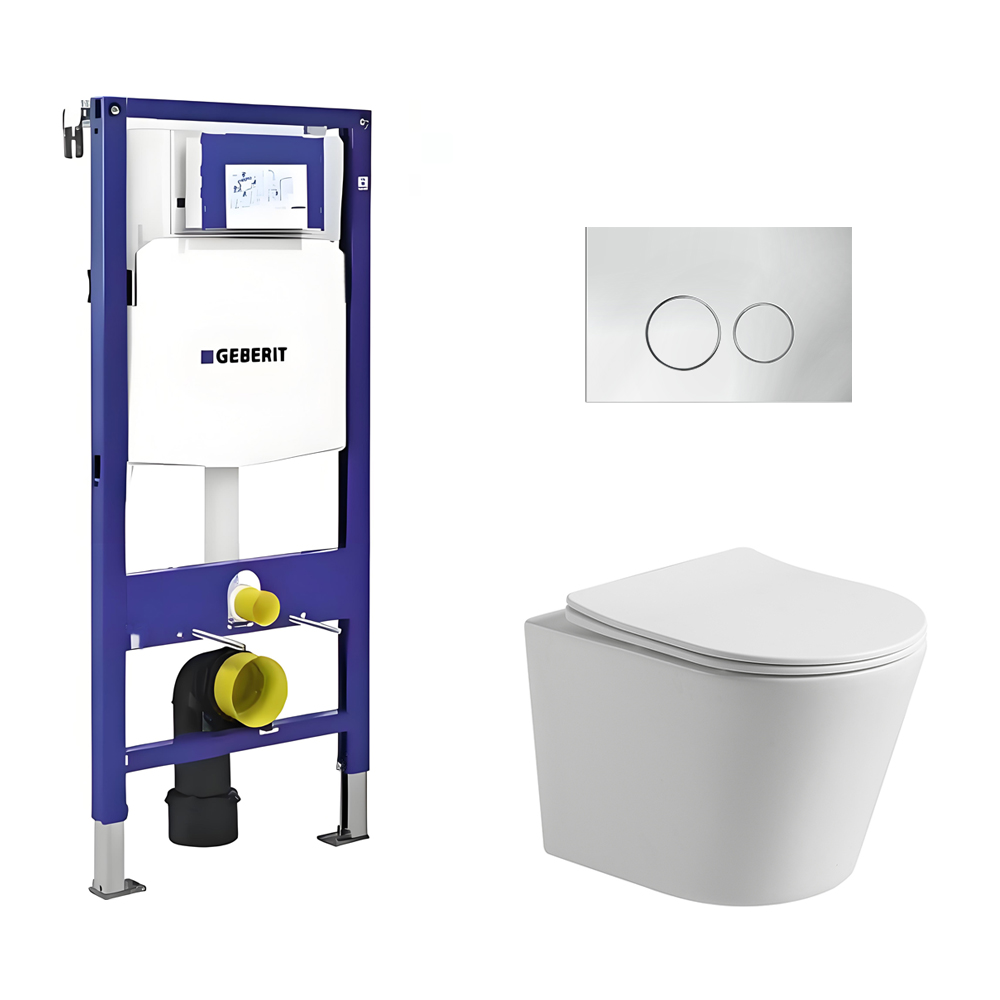 Toiletset Julio randloos mat wit met bedieningspaneel Flat chroom glanzend RVS en Geberit Duofix WC-element (UP320)