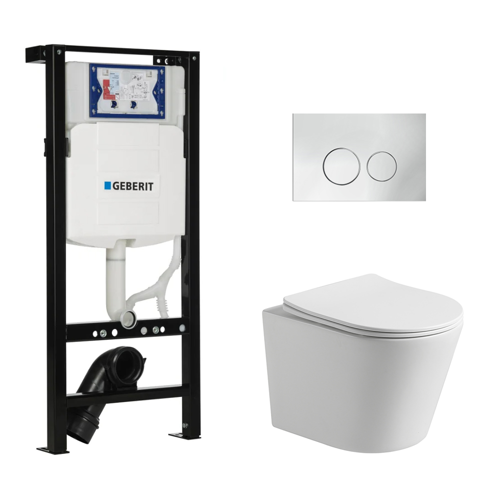 Toiletset Julio randloos mat wit met bedieningspaneel Flat chroom glanzend RVS en Plieger Duofix WC-element (UP320)