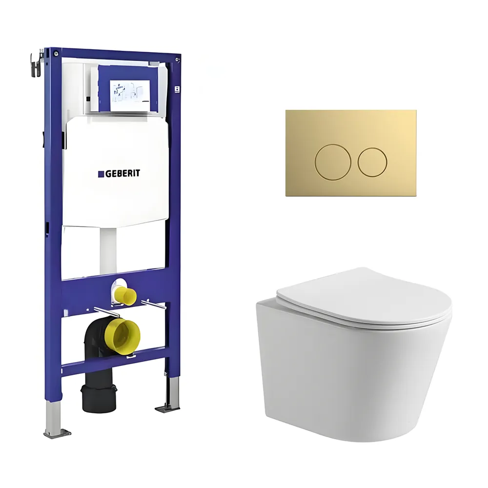 Toiletset Julio randloos mat wit met bedieningspaneel Flat mat goud en Geberit Duofix WC-element (UP320)