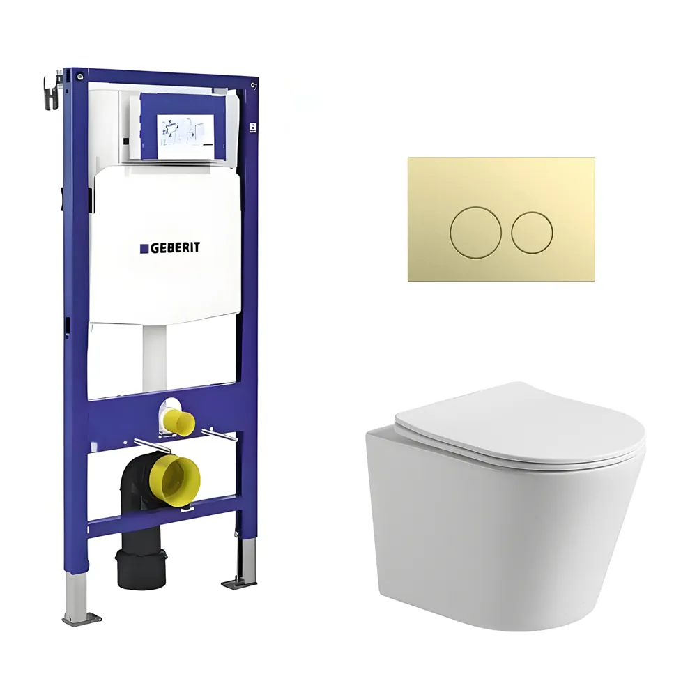 Toiletset Julio randloos mat wit met bedieningspaneel Flat mat goud RVS en Geberit Duofix WC-element (UP320)