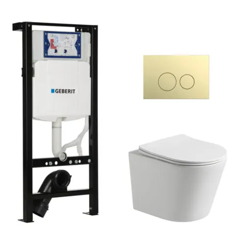 Toiletset Julio randloos mat wit met bedieningspaneel Flat mat goud RVS en Plieger Duofix WC-element (UP320)