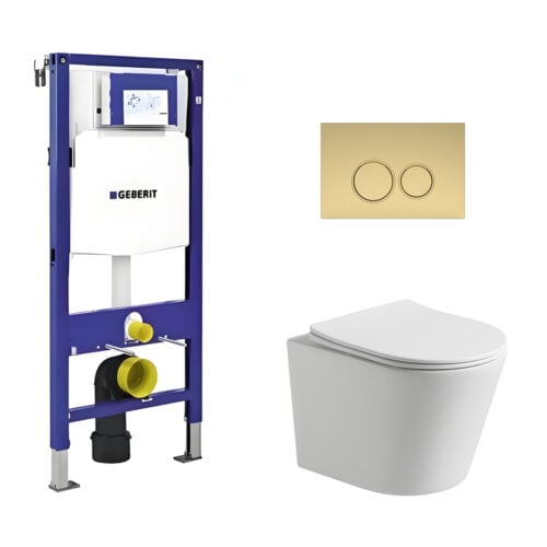 Toiletset Julio randloos mat wit met bedieningspaneel Ring mat goud en Geberit Duofix WC-element (UP320)