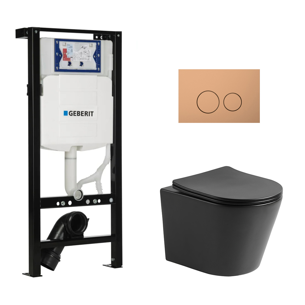 Toiletset Julio randloos mat zwart met bedieningspaneel Flat copper geborsteld RVS en Plieger Duofix WC-element (UP320)