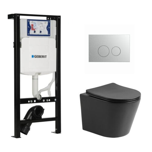 Toiletset Julio randloos mat zwart met bedieningspaneel Flat geborsteld RVS en Plieger Duofix WC-element (UP320)