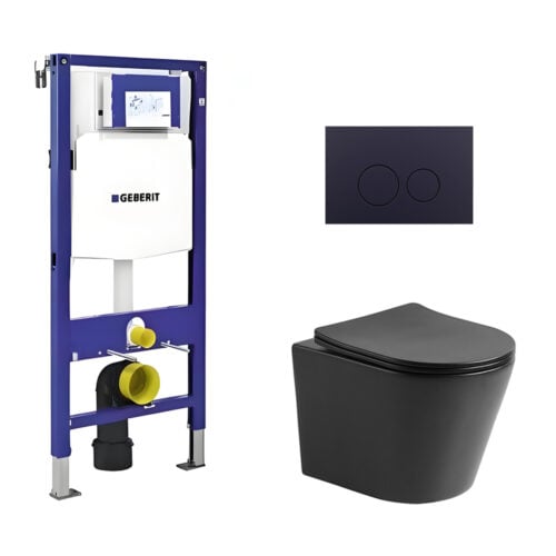 Toiletset Julio randloos mat zwart met bedieningspaneel Flat mat zwart RVS en Geberit Duofix WC-element (UP320)