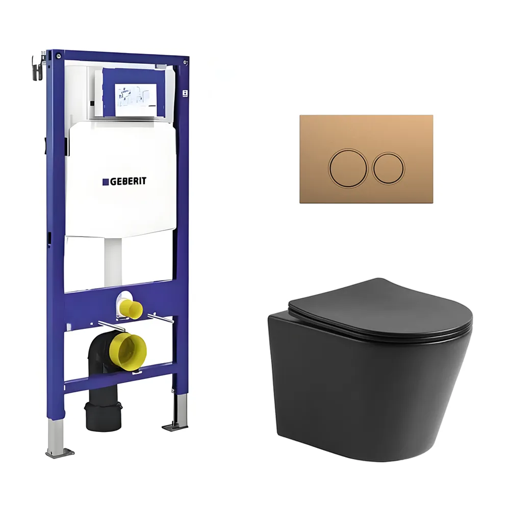 Toiletset Julio randloos mat zwart met bedieningspaneel Ring copper en Geberit Duofix WC-element (UP320)