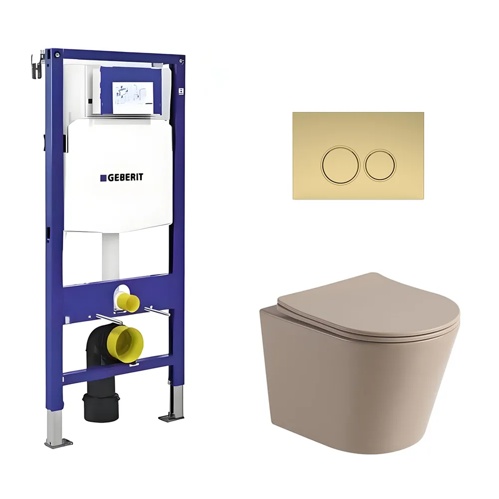Toiletset Julio randloos mat beige met bedieningspaneel Ring mat goud en Geberit Duofix WC-element (UP320)