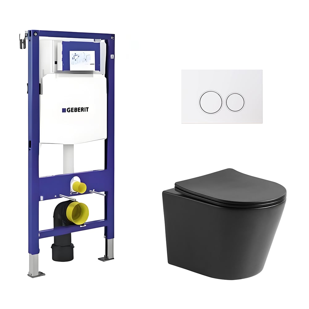Toiletset Julio randloos mat zwart met bedieningspaneel Ring mat wit en Geberit Duofix WC-element (UP320)