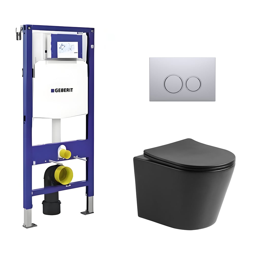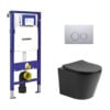 Toiletset Julio randloos mat zwart met bedieningspaneel Ring RVS en Geberit Duofix WC-element (UP320)