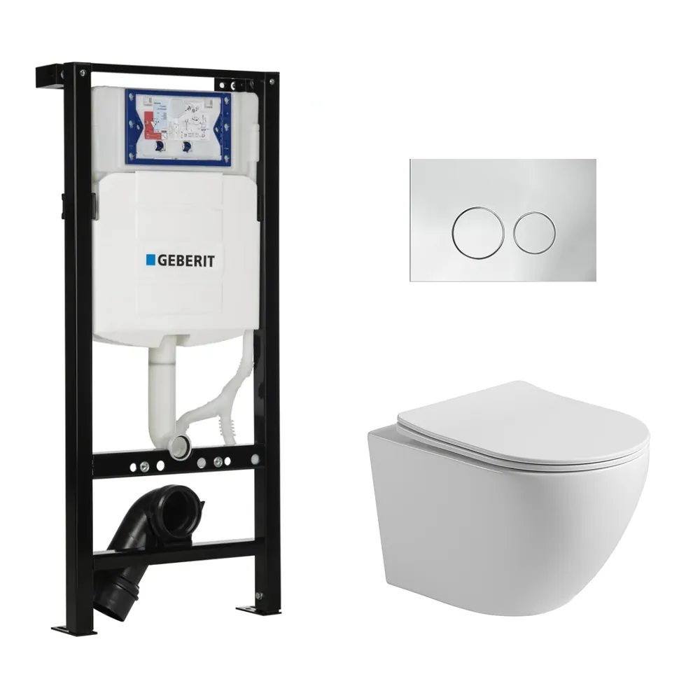 Toiletset Pietro randloos glans wit met bedieningspaneel Flat chroom glanzend RVS en Plieger Duofix WC-element (UP320)