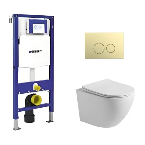 Toiletset Pietro randloos glans wit met bedieningspaneel Flat mat goud RVS en Geberit Duofix WC-element (UP320)
