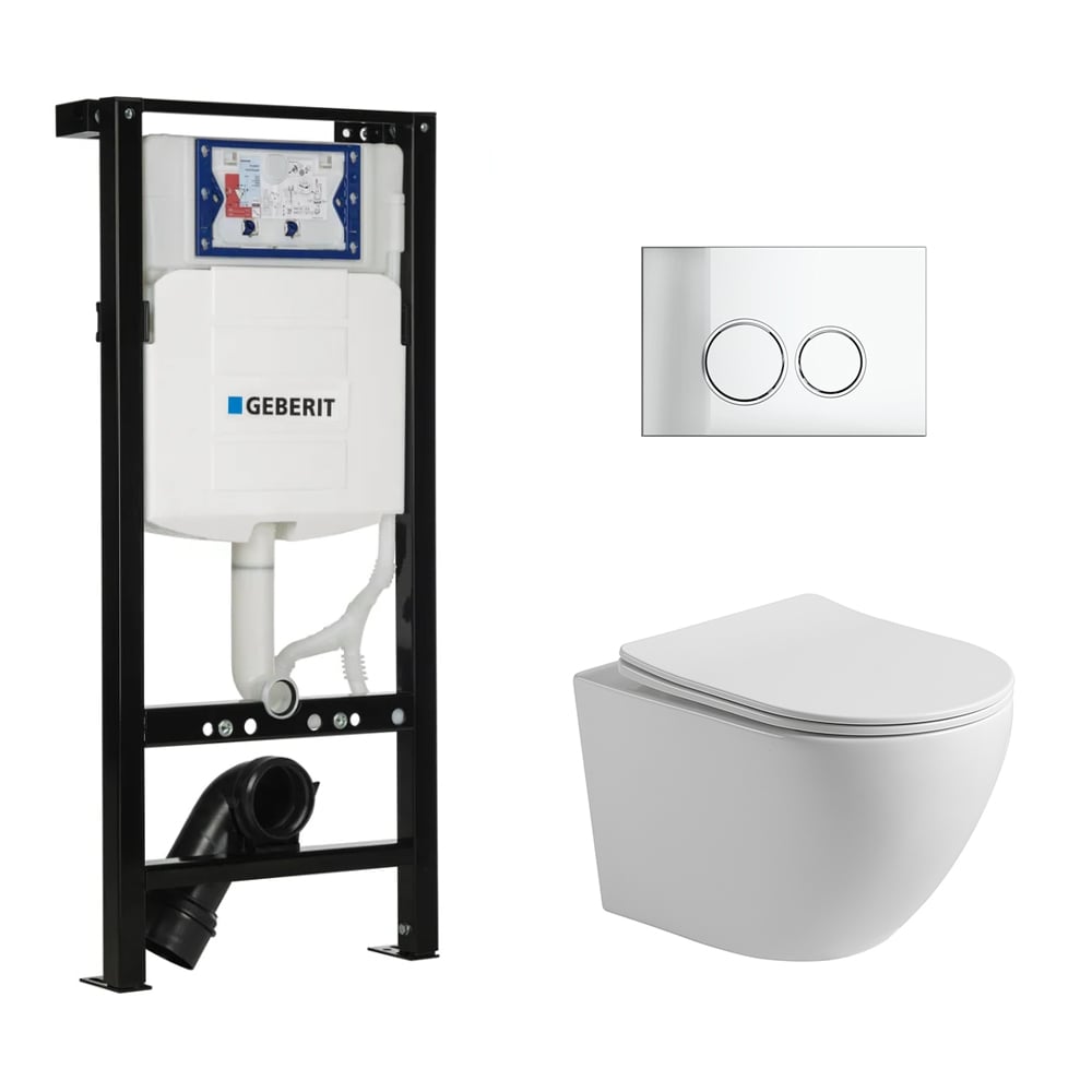 Toiletset Pietro randloos glans wit met bedieningspaneel Ring chroom en Plieger Duofix WC-element (UP320)