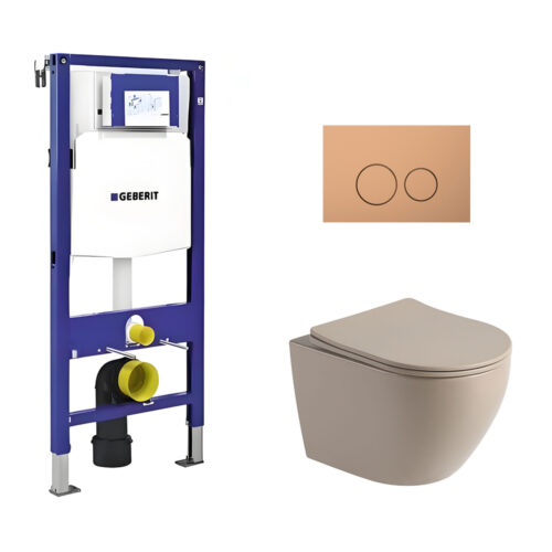 Toiletset Pietro randloos mat beigemet bedieningspaneel Flat copper geborsteld RVS en Geberit Duofix WC-element (UP320)