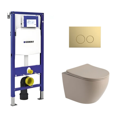 Toiletset Pietro randloos mat beige met bedieningspaneel Flat mat goud en Geberit Duofix WC-element (UP320)