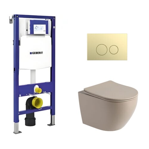 Toiletset Pietro randloos mat beige met bedieningspaneel Flat mat goud RVS en Geberit Duofix WC-element (UP320)