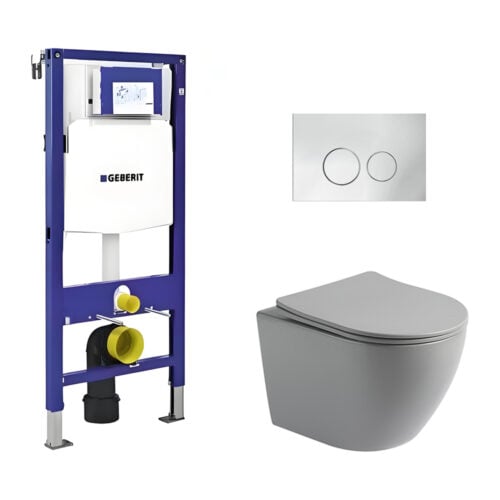 Toiletset Pietro randloos mat grijs met bedieningspaneel Flat chroom glanzend RVS en Geberit Duofix WC-element (UP320)