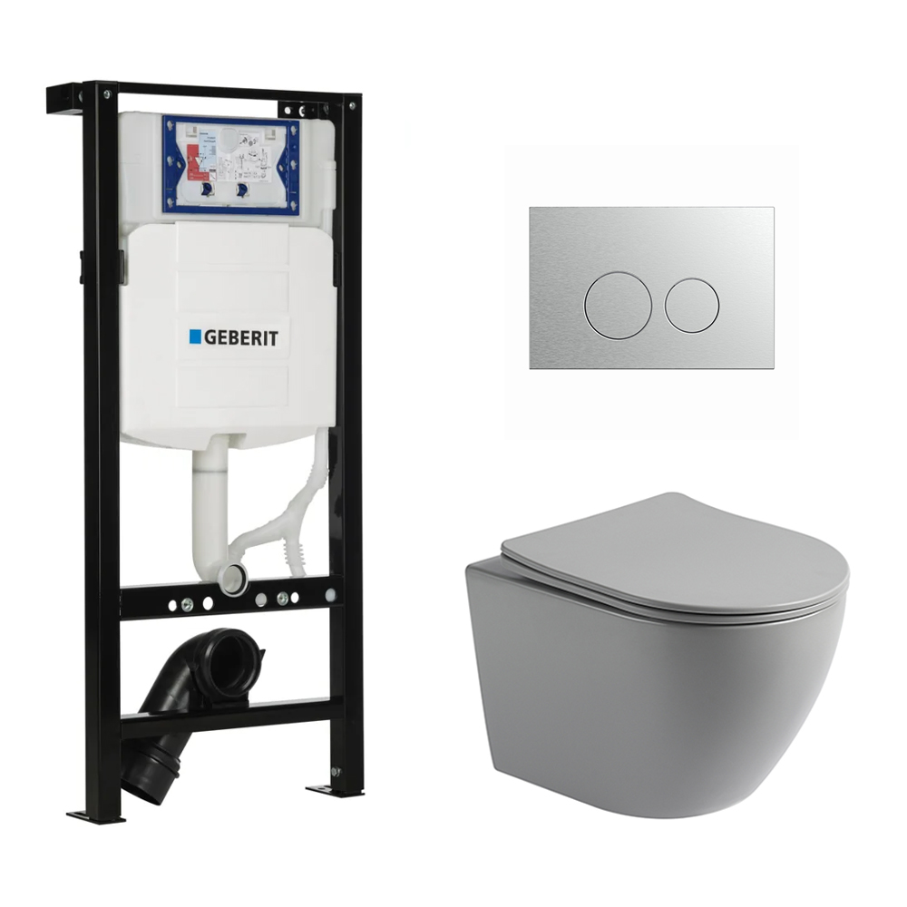 Toiletset Pietro randloos mat grijs met bedieningspaneel Flat geborsteld RVS en Plieger Duofix WC-element (UP320)