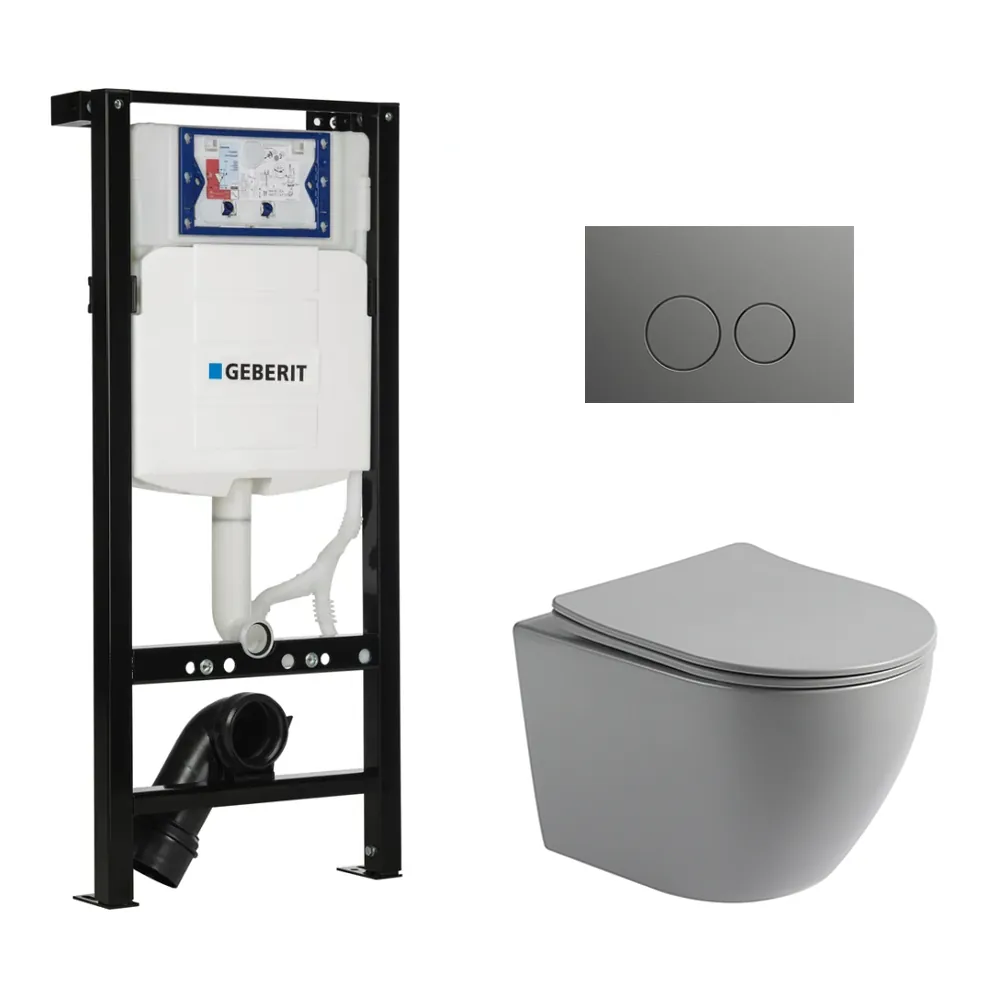 Toiletset Pietro randloos mat grijs met bedieningspaneel Flat gun metal geborsteld RVS en Plieger Duofix WC-element (UP320)