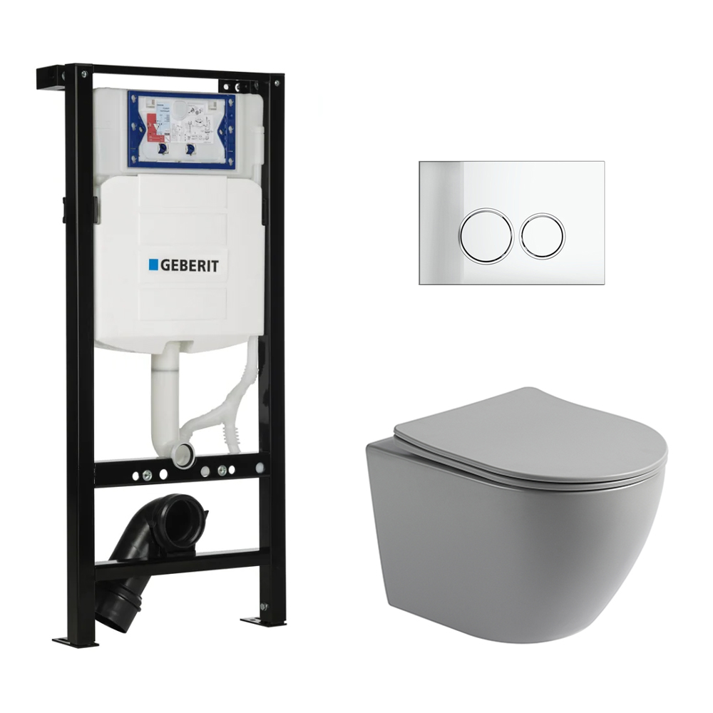 Toiletset Pietro randloos mat grijs met bedieningspaneel Ring chroom en Plieger Duofix WC-element (UP320)