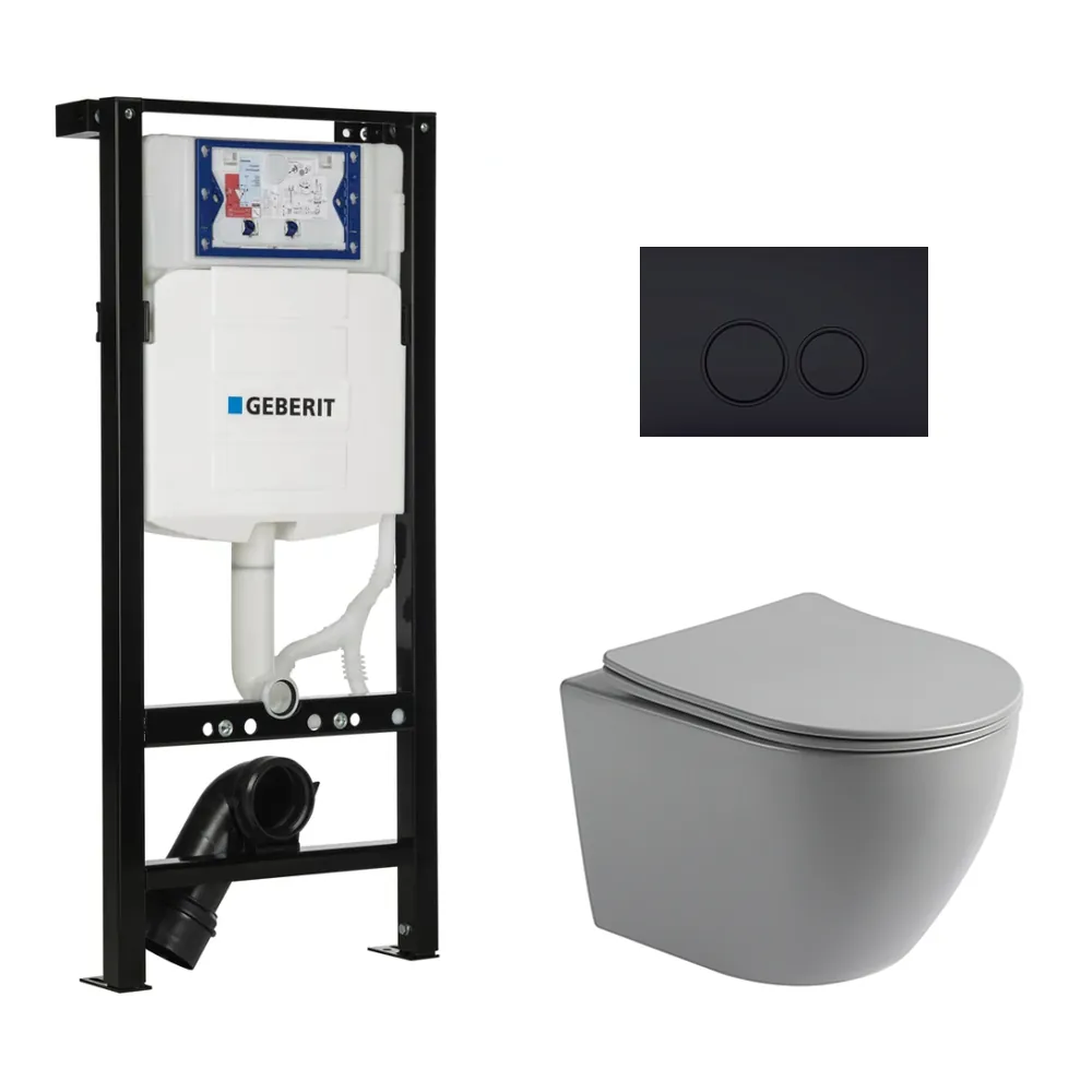 Toiletset Pietro randloos mat grijs met bedieningspaneel Ring mat zwart en Plieger Duofix WC-element (UP320)