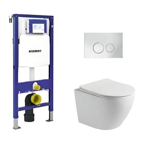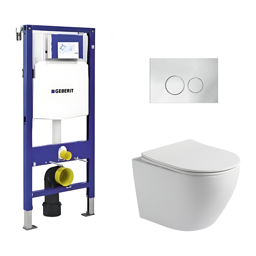 Toiletset Pietro randloos mat wit met bedieningspaneel Flat chroom glanzend RVS en Geberit Duofix WC-element (UP320)