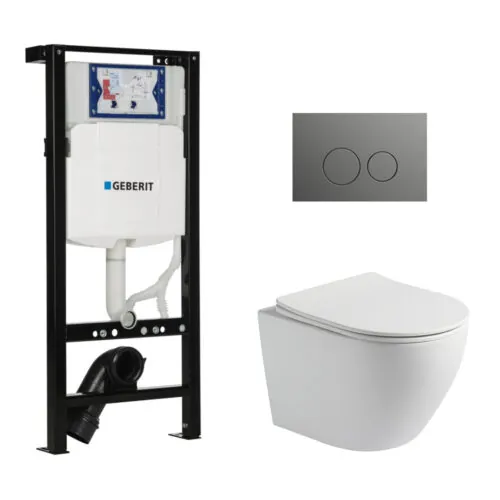 Toiletset Pietro randloos mat wit met bedieningspaneel Flat gun metal geborsteld RVS en Plieger Duofix WC-element (UP320)