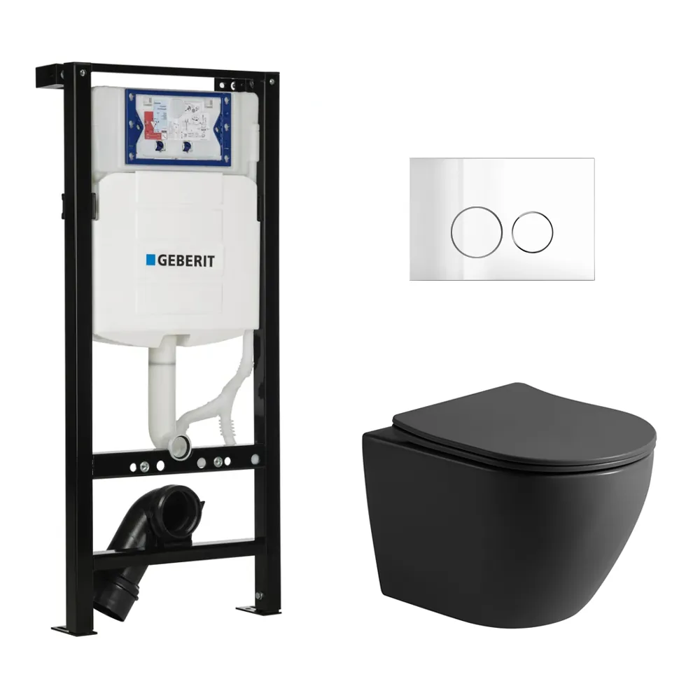 Toiletset Pietro randloos mat zwart met bedieningspaneel Flat chroom en Plieger Duofix WC-element (UP320)