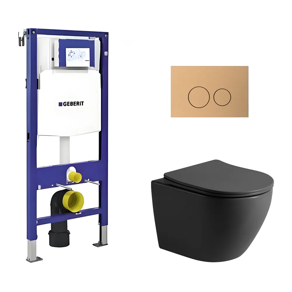 Toiletset Pietro randloos mat zwart met bedieningspaneel Flat copper en Geberit Duofix WC-element (UP320)
