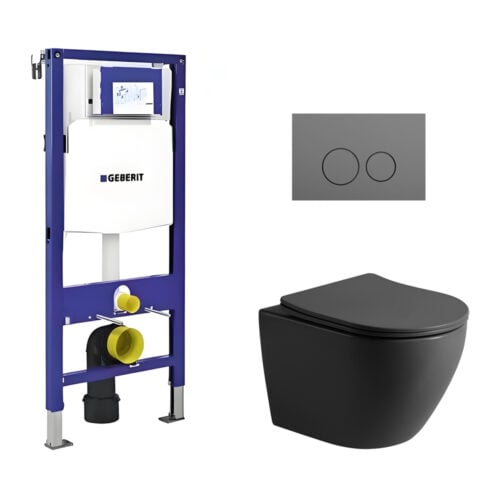 Toiletset Pietro randloos mat zwart met bedieningspaneel Flat gun metal en Geberit Duofix WC-element (UP320)