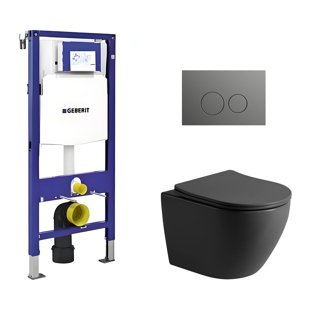 Toiletset Pietro randloos mat zwart met bedieningspaneel Flat gun metal geborsteld RVS en Geberit Duofix WC-element (UP320)