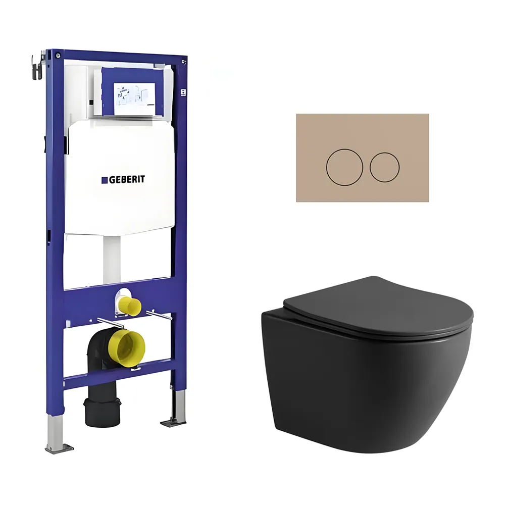 Toiletset Pietro randloos mat zwart met bedieningspaneel Flat mat beige en Geberit Duofix WC-element (UP320)
