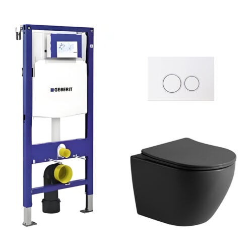 Toiletset Pietro randloos mat zwart met bedieningspaneel Ring mat wit en Geberit Duofix WC-element (UP320)